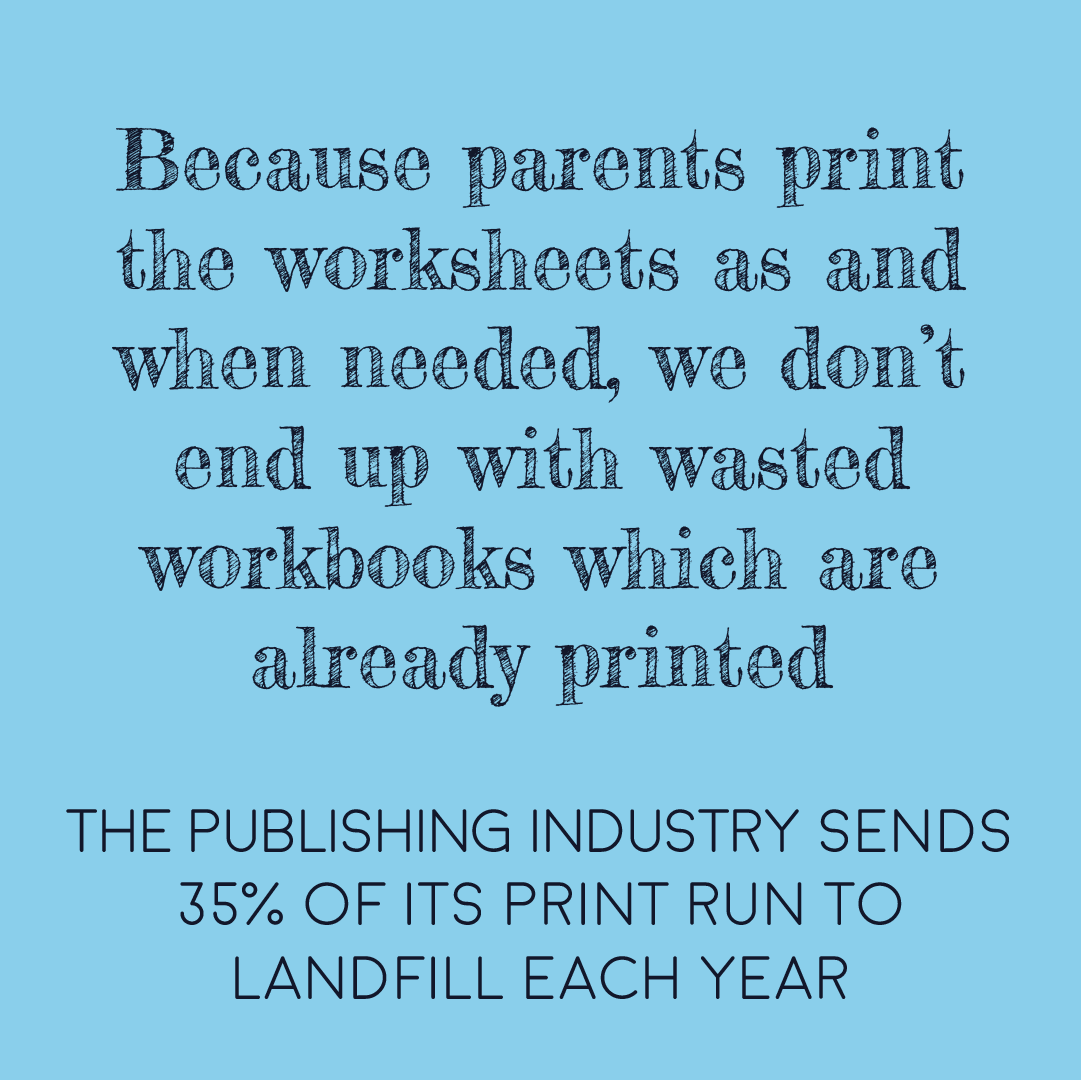 Our workbooks are a combination of online and printable activities, which means we limit the amount of paper that’s needed. Lots of longer explanations can use videos, illustrations or infographics rather than words on printed pages. The worksheets are mostly used for writing out answers or completing activities which are difficult online, like drawing maps or wordsearches.