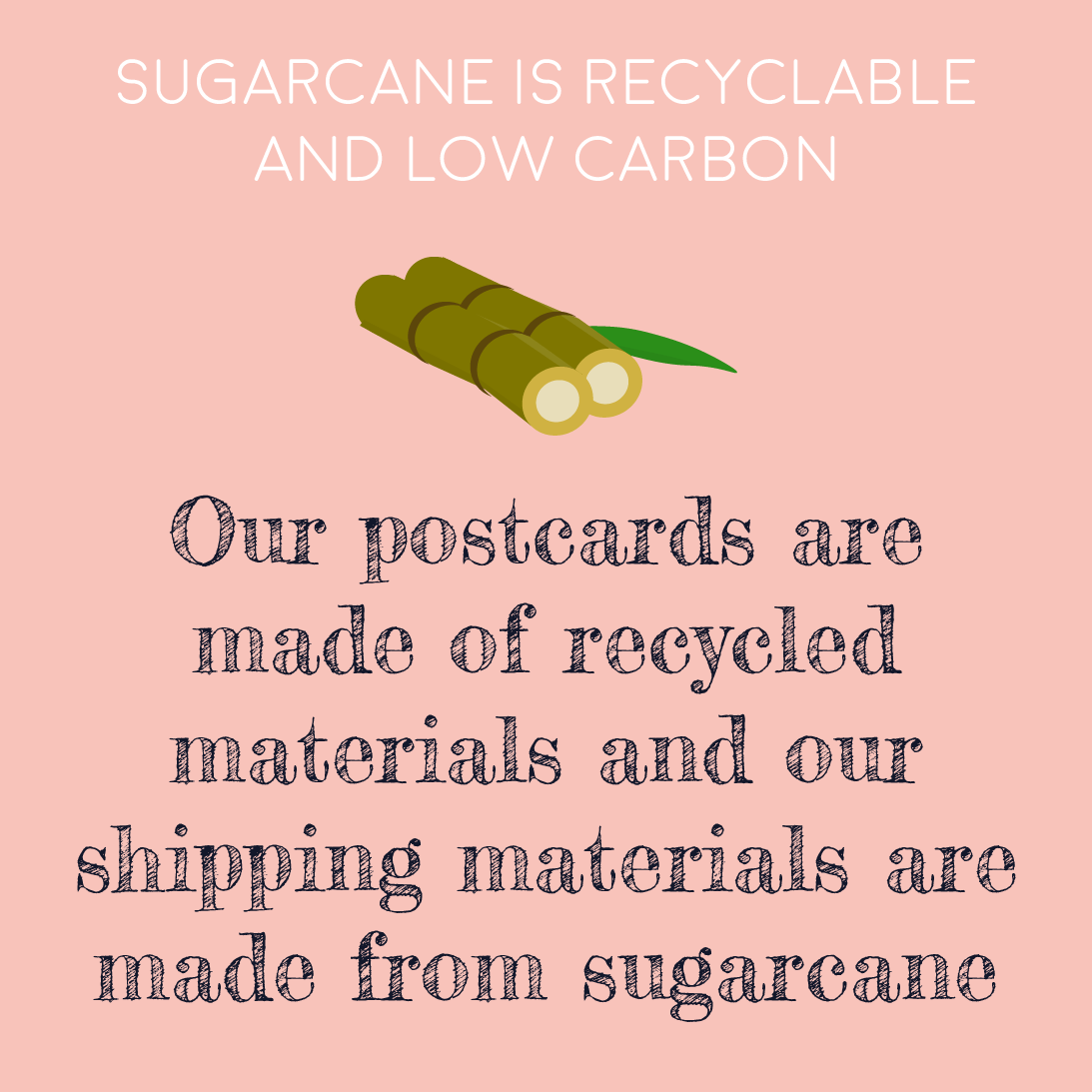 The postcards we use are recycled, as are most of the other printed materials in our Travel Packs (excluding the stickers). The packaging we use is made from sugarcane pulp, also called bagasse. Sugarcane is fast growing, like bamboo and the pulp is a by-product of producing sugar. Bagasse itself is both recyclable (with cardboard) or compostable in home compost bins.