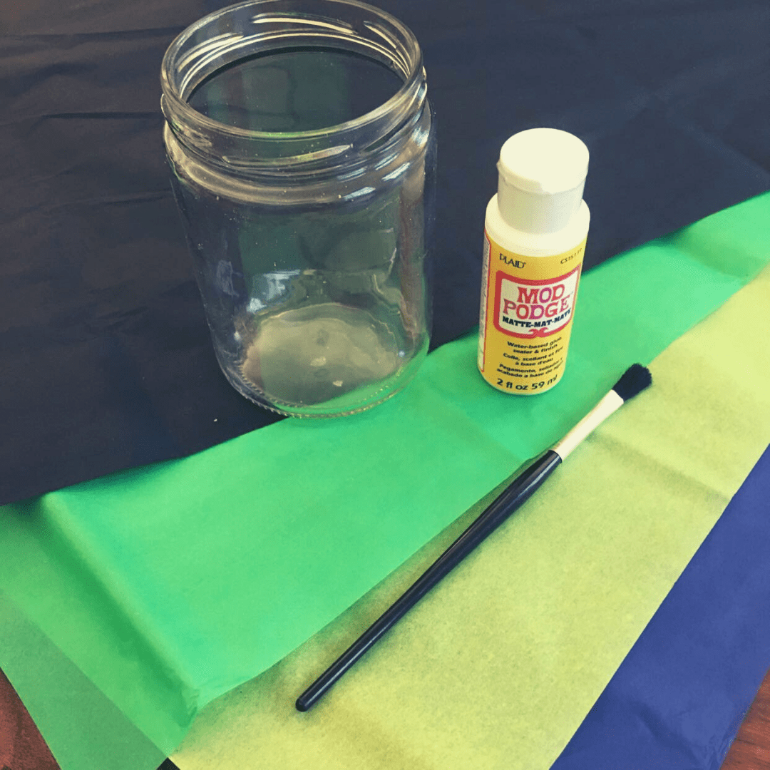3. When the tissue paper covers the whole jar, apply a coat of Mod Podge or white glue.