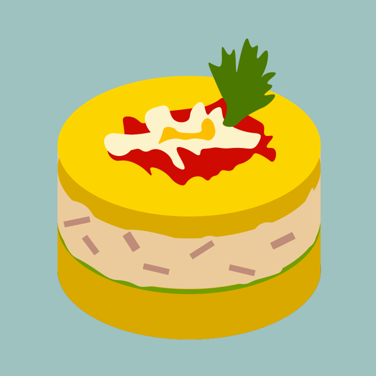 is made of two layers of mashed potato with a filling (like a sandwich). The filling is often avocado, tuna and amarillo sauce.