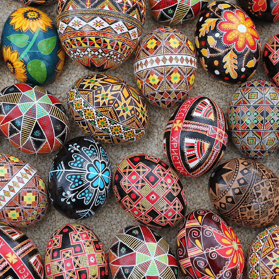 At Easter many Ukrainian people paint eggs with beautiful patterns. Some families have special designs which have belonged to their family for hundreds of years.
