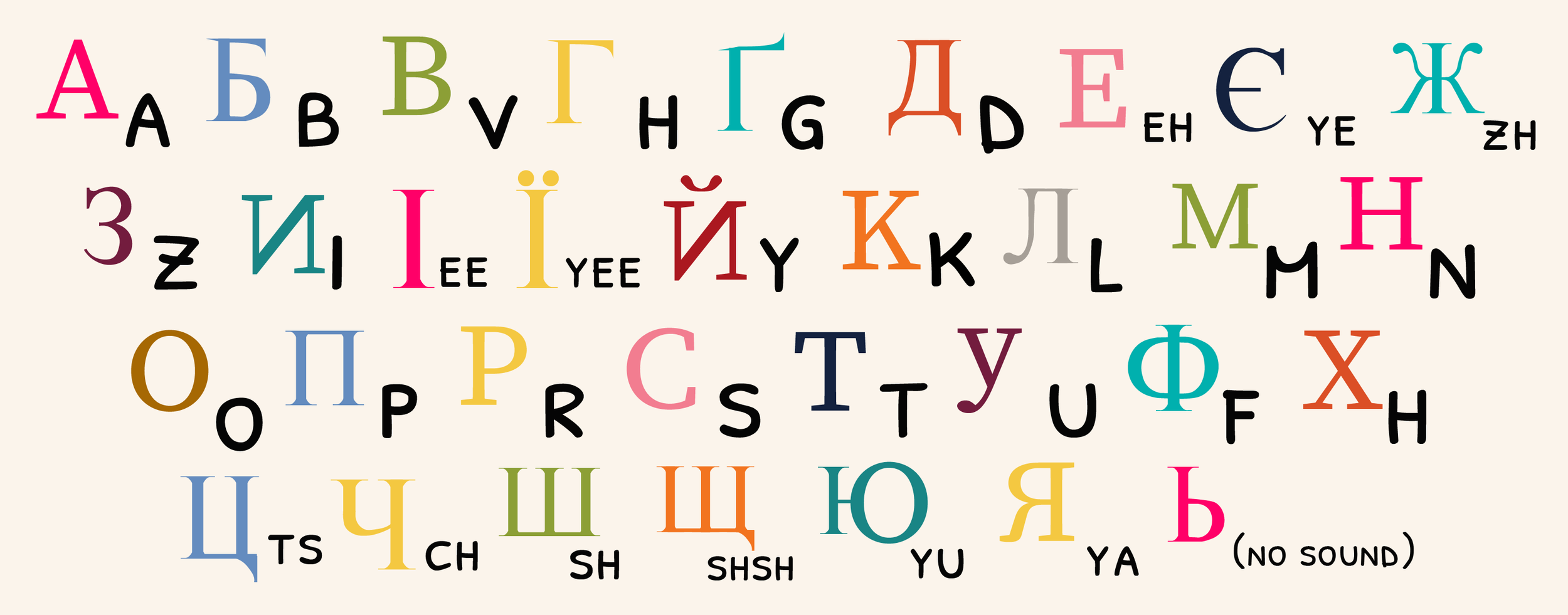 The Ukrainian language is quite similar to Russian - they share about 62% of words - but they are different languages. They also share an alphabet, called Cyrilic, which you may have seen before.