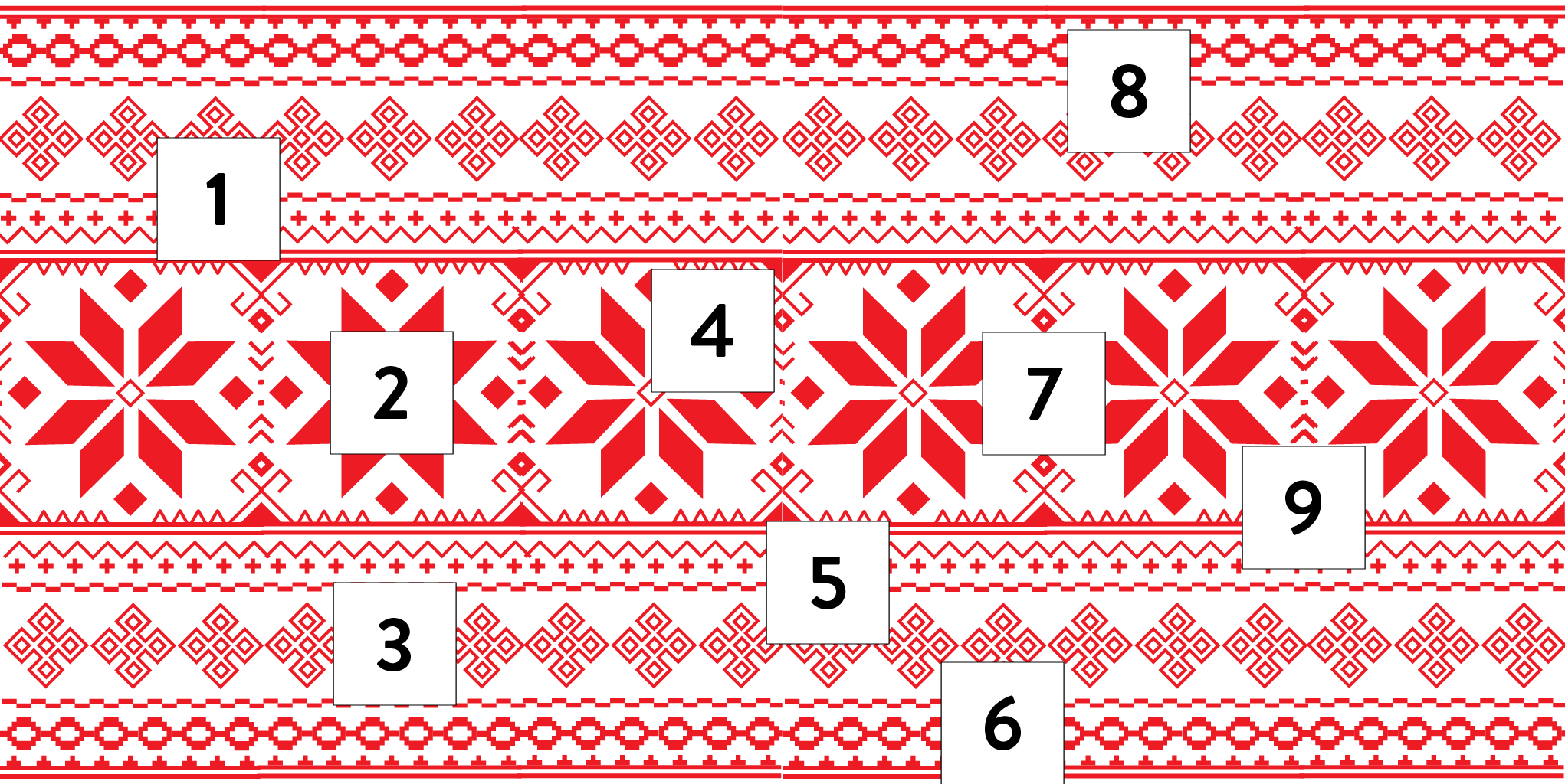 This puzzle uses non-verbal reasoning which involves recognizing patterns. Below is a strip of vyshyvanka embroidery, with 9 squares missing. Can you figure out which square goes in which gaps? Look carefully for the shapes that make sense.