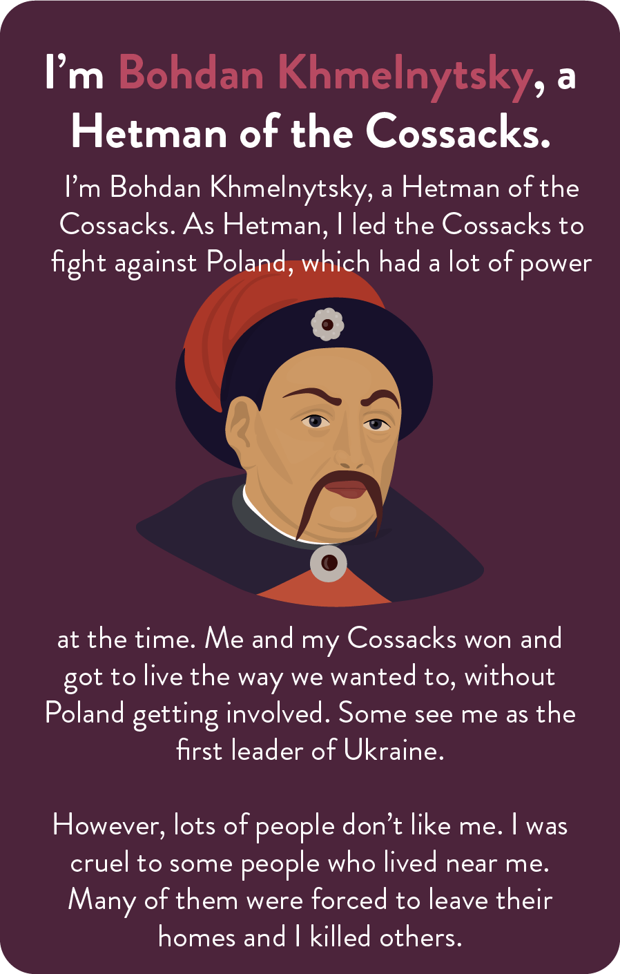 The leader of the Cossacks was always called the Hetman. The most famous Cossack Hetman was called Bohdan Khmelnytsky. He marched the Zaporozhian Cossacks to Kyiv and won more freedom for the Cossack people.
