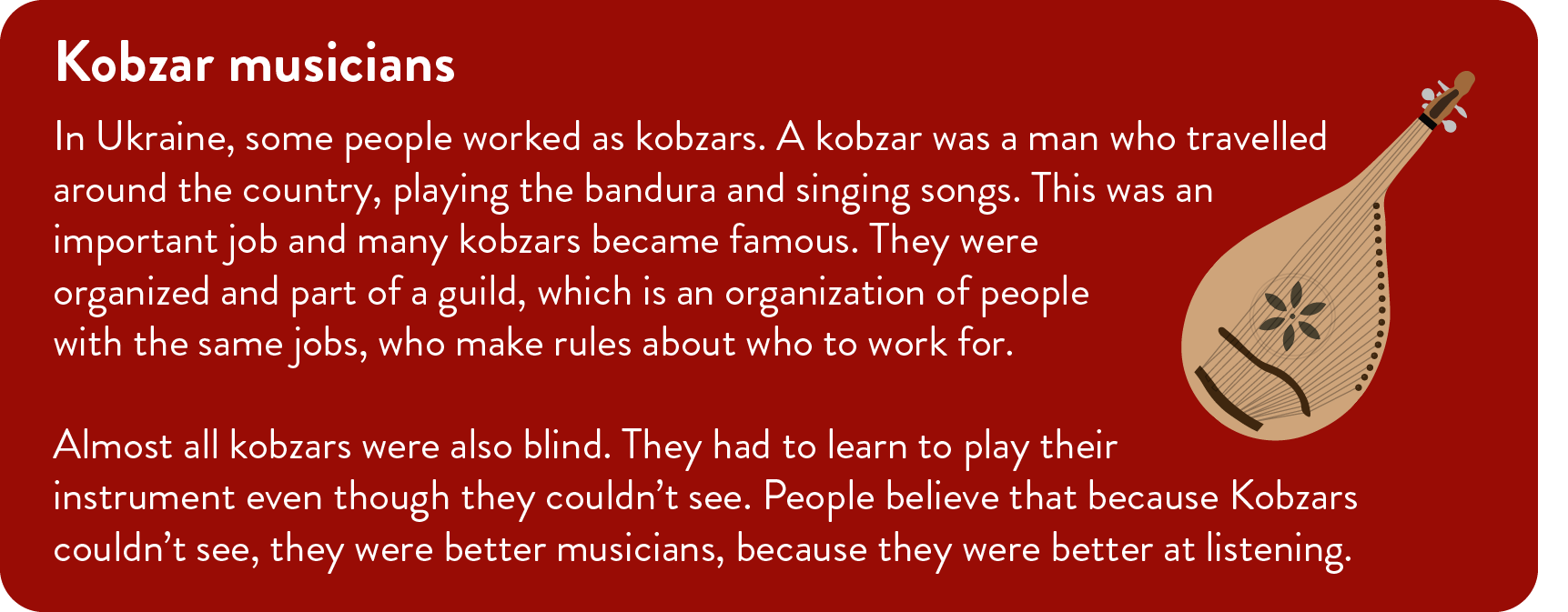 Cossacks would all cook together at night, sharing the same cooking pot and the same food, all sitting together. After dinner someone might play the bandura, a type of instrument like a guitar that many Cossacks loved to listen to. They would tell stories and sing songs. Many of those stories and songs are still around today.