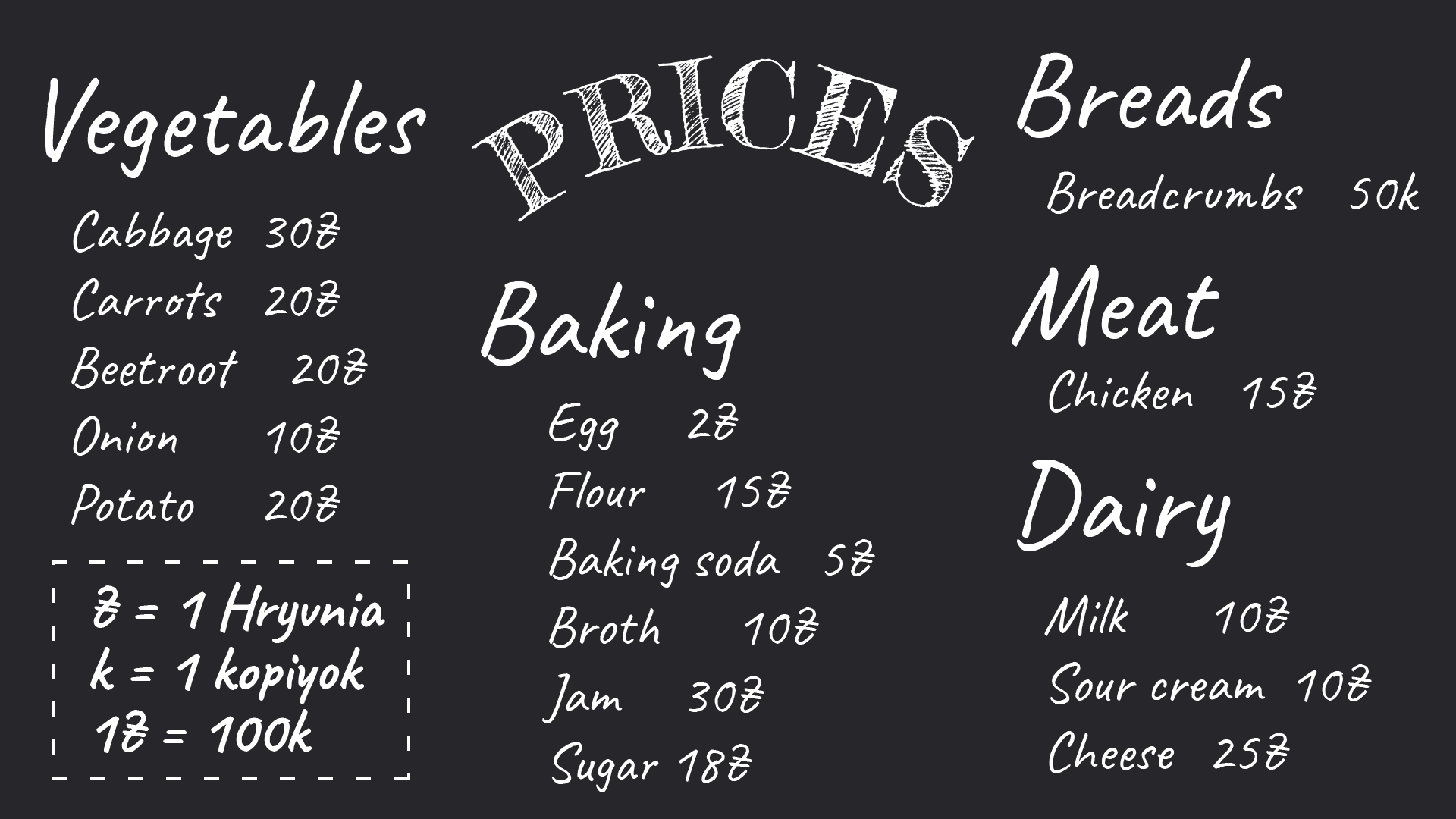 Ukrainian food is delicious! It uses lots of things that can be grown in Ukraine like potatoes, beetroot, cabbage and flour (made from wheat). Here are a few delicious recipes, with their ingredients.
