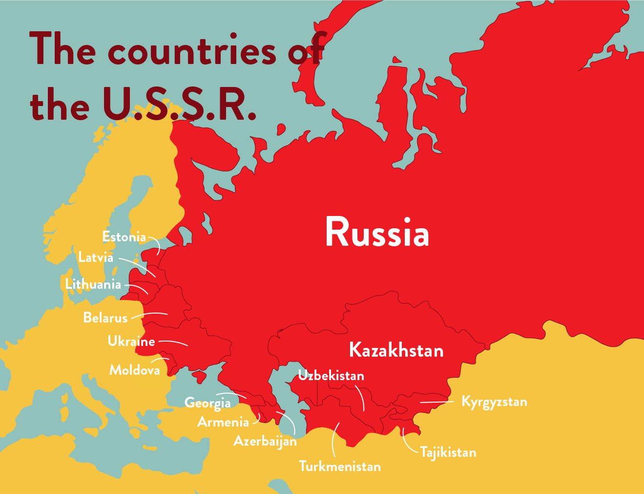 Maybe you’ve heard of the U.S.S.R. before. It stands for the Union of Soviet Socialist Republics, although it doesn’t exist anymore. The U.S.S.R. was a group of countries led by Russia but included lots of smaller nearby countries like Latvia, Georgia, Turkmenistan, Kazakhstan, Tajikistan and others.