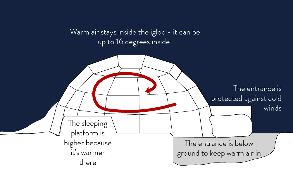 Igloos look like simple buildings made from blocks of ice, but they’re actually very well designed. You have to crawl through a small tunnel to get into an igloo. That means that the warm air already inside the igloo stays inside, because warm air rises. Even if it was freezing cold outside, it could be 16° C inside an igloo.